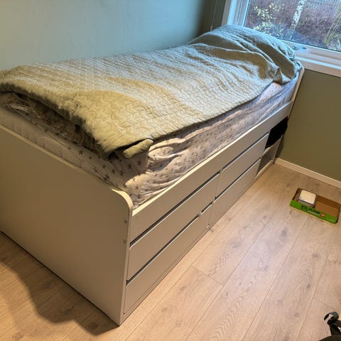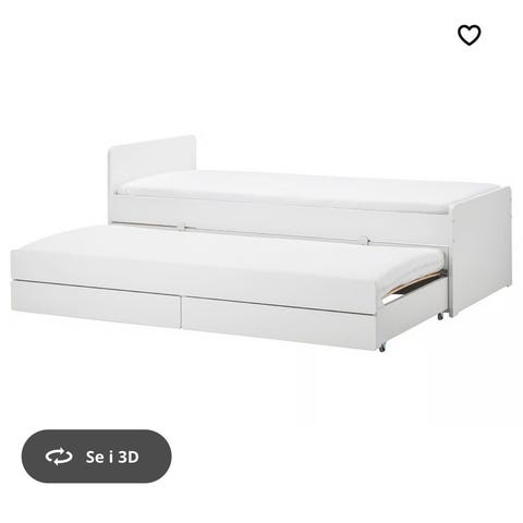 IKEA dagbed med uttrekk og oppbevaringsskuffer i hvit utførelse. Sengen har en hovedseng og en uttrekkbar ekstraseng . Under er det integrerte skuffer som gir ekstra oppbevaringsplass. Egnet som enkeltseng til daglig bruk og kan trekkes ut til to liggeplasser ved behov. Ene ribben til hovedenhet er knukket og fikset.er mulig å kjøpe nye på IKEA for 200,-