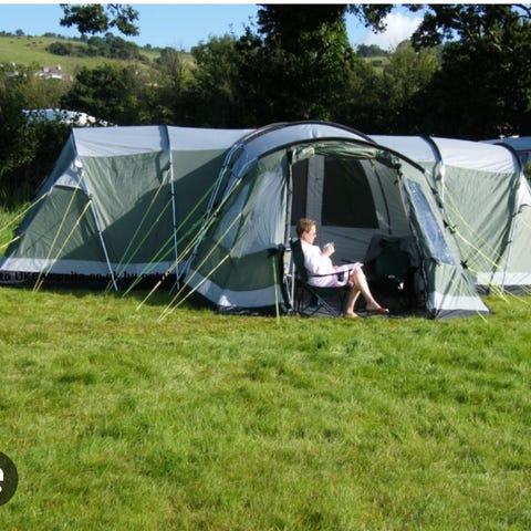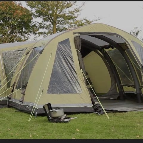 Stort tremannstelt med stort sitteområde hvor det er plass til stoler og bord inne i det første rommet. Man kan stå helt oppreist inne i teltet.