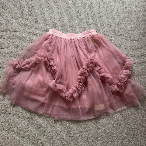 Tyllskjørt fra WoolLand str 122/128. Skjørtet har gått opp litt i hyllen, men det er på undersiden av første lag med tyll så det synes ikke. Kan nok fikses med nål og tråd for de som kan sånt. Ellers i fin stand og lite brukt.