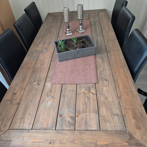 Solid spisebord med flotte detaljer. To lemmer til forlengelse av bordet, på hver side, med låsemekanisme. Bordet er ca. 84 cm bredt, uten lemmer er lengden ca. 140 cm, hver lem er ca. 47 cm. På undersiden (som ikke synes) har litt av treverket på brakettene gått litt av, men det har ingen ting å si for funksjonaliteten.