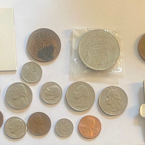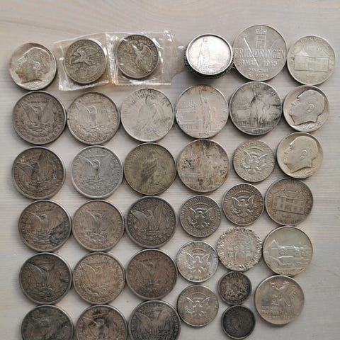 78 stk crowns, 5 pounds, 2 pounds, dollars, 25 pence etc store mynter fra England og commonwealth land (noen dollarmyntrer fra Liberia). Flere duplikater