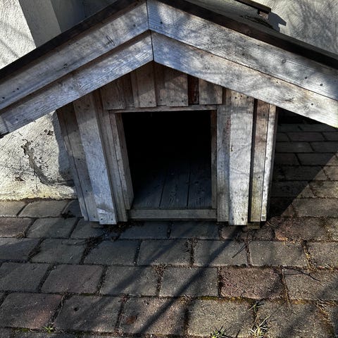 MÅ HENTES. Gir bort dette hundehuset med tak som kan åpnes for tilgang til innsiden. Det har så og si aldri vært en hund i det ettersom vår ikke ville det. Det er likevel i ganske dårlig stand etter å ha stått ute gjennom alle årstider i flere år.