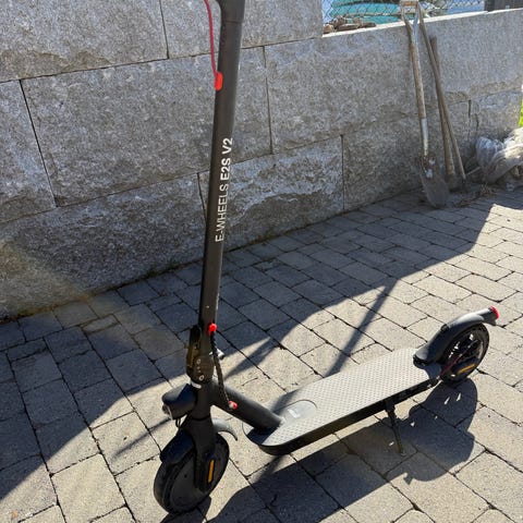 E-wheels E2S V2 2023 elektrisk sparkesykkel med lang rekkevidde i svart farge. Modellen har ståbrett med antiskli-overflate og sammenleggbar styrestang for enklere lagring og transport. På styret sitter et digitalt display som viser hastighet og batterinivå, samt betjeningsknapp for av/på og moduser. Sparkesykkelen har motor i bakhjulet, demping bak og mekanisk brems. Egner seg for bruk på asfalt og jevne underlag til daglig transport over korte og mellomlange avstander for voksne eller eldre barn, avhengig av lokale regler og førerens vekt og høyde.