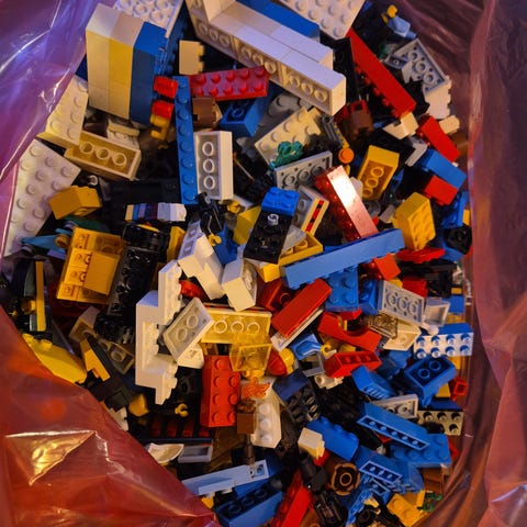 LEGO klosser blandet parti. Inneholder ulike typer og farger av LEGO-klosser og deler, sortert i flere poser. Egner seg til bygging av egne modeller eller som supplement til eksisterende LEGO-samling. Antall deler og eventuelle komplette sett er ikke spesifisert.