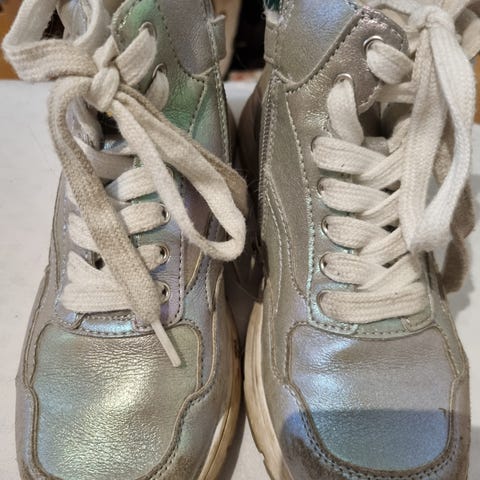 joggesko for jente i størrelse 34. Høymodell med snøring og glidelås på siden. Skoene er i sølvfarget materiale med mykt, teddyfôret innside rundt ankelen. Yttersåle i gummi. Egnet som hverdagssko for barn.