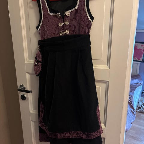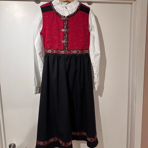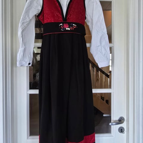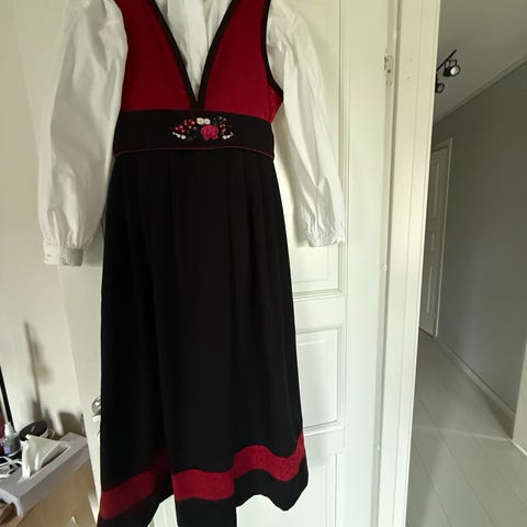 Dette er en norsk kvalitetsdrakt i mørk rød, med langt skjørt og kort jakke. 80% ull.
