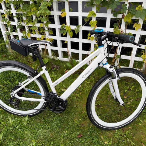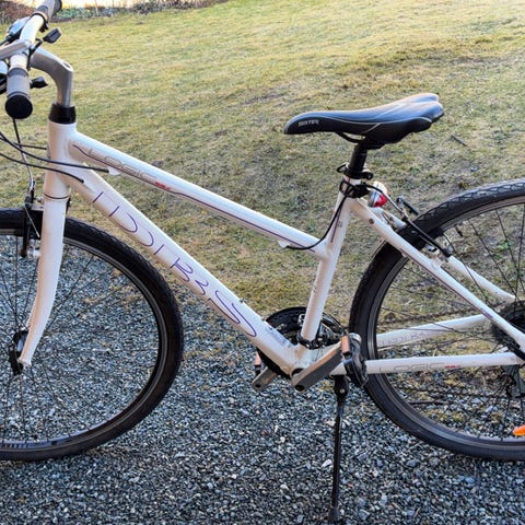DBS terrengsykkel for dame med rammestrørrelse M og 26" hjul. Sykkelen har hvit ramme med rosa detaljer og 21 gir. Terrengdekkene er tilpasset bruk på grus og lettere stier. Egnet som hverdagssykkel og til turer på variert underlag for voksen rytter som passer M-størrelse ramme og 26" hjul. Front demper kan låses. Fremstår i god stand klar til bruk. Noen bruksmerker på rammen.