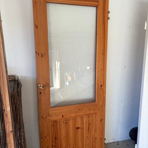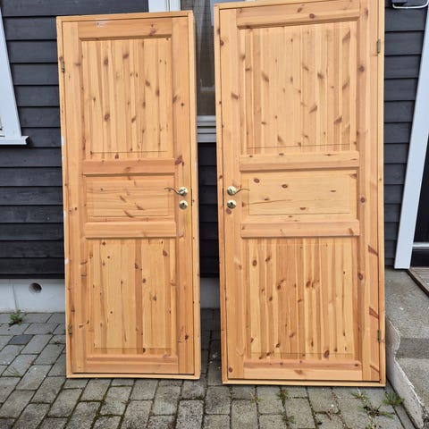 3 stk. innerdør i heltre furu i brun/beiset utførelse. Døren har klassisk firespeilsdesign (90x210cm). Leveres med dørhåndtak og låskasse montert på.