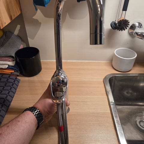 Kjøkkenkran i krom med ettgreps hendel. Høy tut som gir god plass i vasken. Leveres med tilkoblingsslanger som vist på bildene. Passer til standard kjøkkenvask med ett hull for montering.