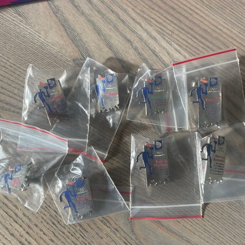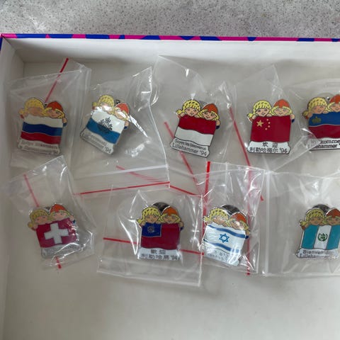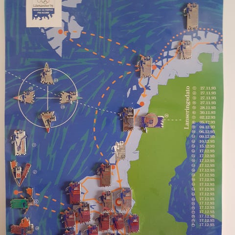 Fakkelpins fra Lillehammer OL fra Akershus, Østfold, Oslo, Oslo (fakkel fra Olympia), Polarsirkelen, Fakkelstafettavslutning på Lillehammer og Lillehammer. Ubrukt, i pose og eske fra NOPK. Se andre pins annonser jeg har liggende ute. Ved kjøp av flere pakker kan vi finne en gunstig samlepris.
