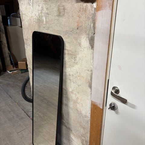IKEA speil med rektangulær form og hvit ramme. Speilet er helfigur og egner seg for plassering på vegg eller som dørfront på garderobe, avhengig av monteringstilbehør. Rammen er i hvitlakkert materiale. Passer til bruk i gang, soverom eller garderobe for helkroppsspeiling.