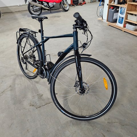 HR/ Swix elektrisk sykkel i størrelse L for unisex. Sykkelen har ramme i svart med røde detaljer og integrert bagasjebrett bak. Den er utstyrt med elektrisk motor i krankområdet og batteri montert på rammen. Styret har display som viser informasjon som hastighet og batterinivå, samt betjeningsknapper for motor assistanse. Sykkelen har skjermer foran og bak, støtte og fastmonterte lys foran og bak for bedre synlighet. Passer til pendling og hverdags sykling på vei og lett grus.