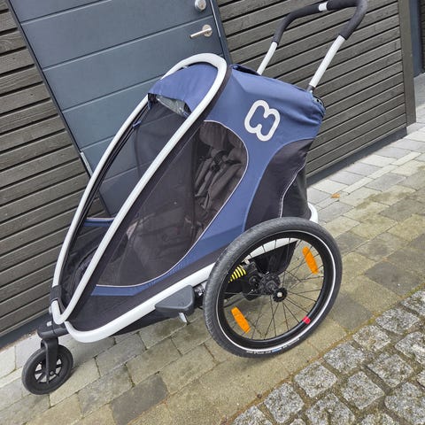 Den selges med både joggehjul og det originale lille fremhjulet som følger med, så den kan enkelt brukes både til sykling, trilleturer og jogging. Vognen har god fjæring, høy komfort og god plass – perfekt for både korte og lengre turer. Glidelåsen til regntrekket mangler, men