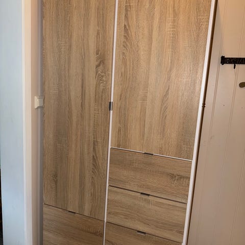 God oppbevaringsplass med hyller, hengestang og 3 skuffer.