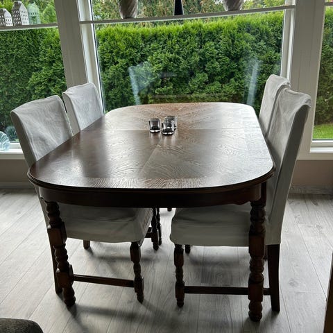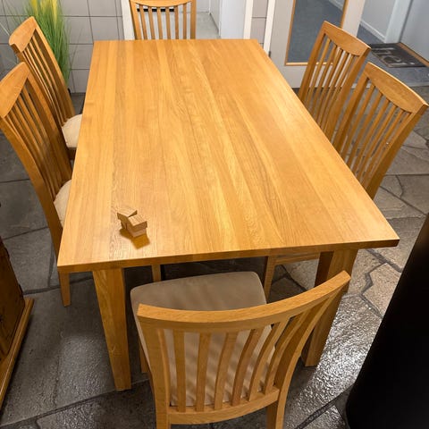 Heltre eik spisestue med 8 stoler(også heltre eik). Bord 100 cm bredde, 180 cm lengde. 4 ileggsplater på 50 cm, totalt 380 cm. Bordet er pent brukt. 5 stoler er helt fine, mens det er flekker/skjolder på sitteputen på 3 av dem. Må hentes(ganske tungt..).