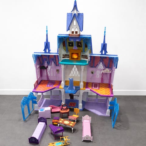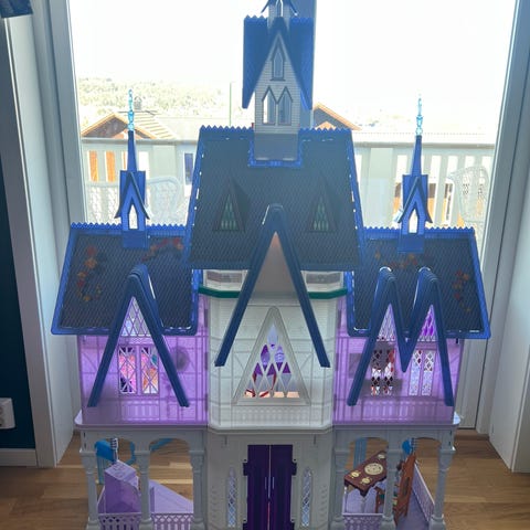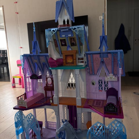 Disney Frost dukkehus med flere etasjer og is-slottdesign. Huset har åpne romløsninger med trykk av iskrystaller og slottselementer. Medfølgende figurer inkluderer blant annet Elsa, Anna, Olaf, Sven og andre karakterer fra Frost-universet i ulike størrelser. Dukkehuset har innebygde møbler som stol, bord og piano, samt trapp mellom etasjene. Egner seg til lek med Frost-figurer og andre små dukker i tilsvarende størrelse.