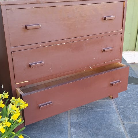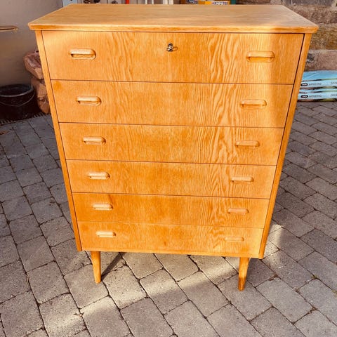 Selger denne kommoden, heltre, med finer. Noe skader og lyter, som vist på bilder, men dette er sikkert enkelt å fikse. De to nederste skuffene var trege å få ut, er sikkert bare å pusse litt på vangene så går dette fint. Må hentes.