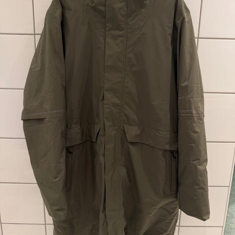 Jakke i grønn farge, laget i polyester. Modellen har hette og glidelås foran, samt lommer med klaff og glidelås. Lengden går godt ned over hofter/lår for ekstra beskyttelse mot regn.