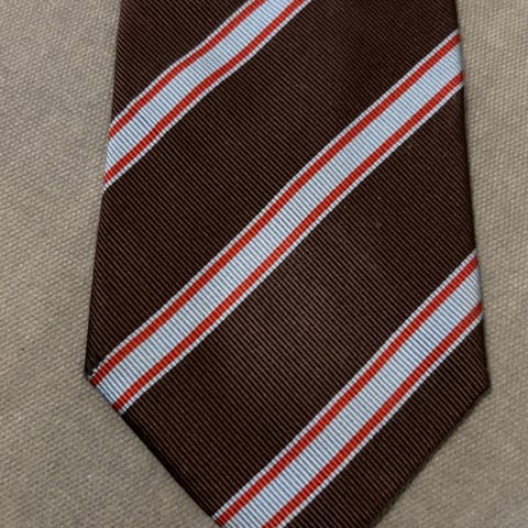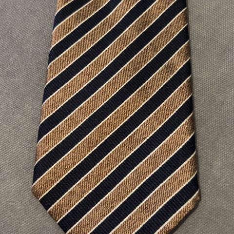 Klassisk slips i 100 % silke. Måler 9,5 cm. på det bredeste. Ingen flekker eller spor av bruk.