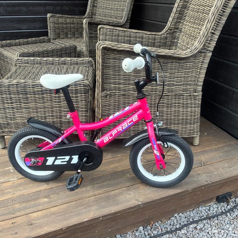Barnesykkel 12" med støttehjul i rosa og hvit farge, med kurv foran og pedalbrems. Sykkelen har lav innstigning og passer til mindre barn som skal lære å sykle. I tillegg følger det med en trehjuls sparkesykkel i rosa og blå farger, tilpasset små barn. Utstyr som hjelm vises på bildene og kan eventuelt følge med etter avtale. Passer ca 2-3 åring