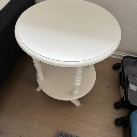Bordet har rund bordplate og skråstilte ben med en rund hylle under bordplaten.