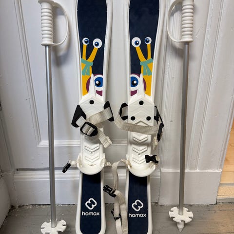 Hamax barneski med staver. Enkle plastski med integrerte bindinger som passer til vanlige vintersko. Leveres sammen med tilhørende staver. Egnet til lek og introduksjon til ski for mindre barn på flatere underlag som hage, park eller barnehageområde.