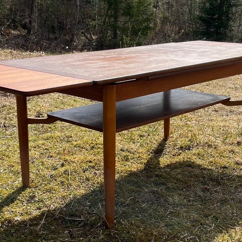 Bordet er stødig og pent brukt. Det er normal bruksslitasje som forventet av et vintage møbel, men ingen store skader eller dype hakk. Mekanismen for platene fungerer fint.
