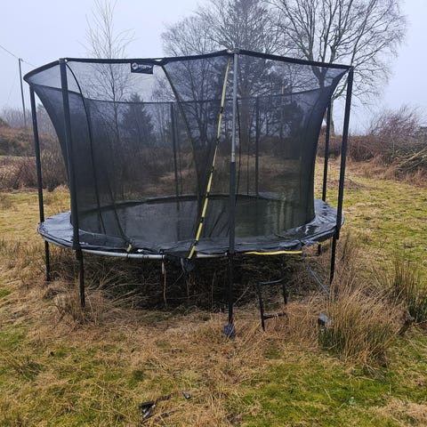 Solid trampoline gis bort mot demontering og henting. Kraftigere ramme enn de fleste andre trampoliner.