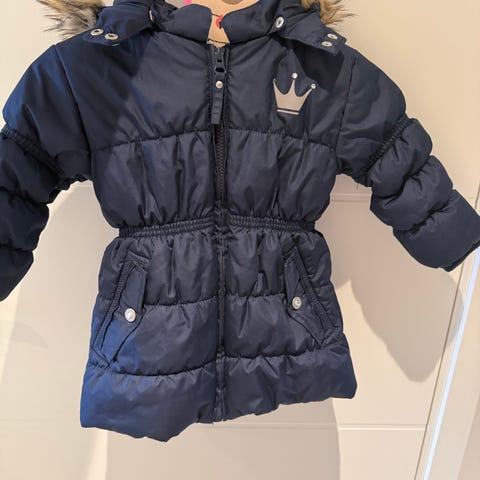 Fin blå vinterjakke str 2 år. Varm og vindtett. Fuskepels på hetta kan tas av.