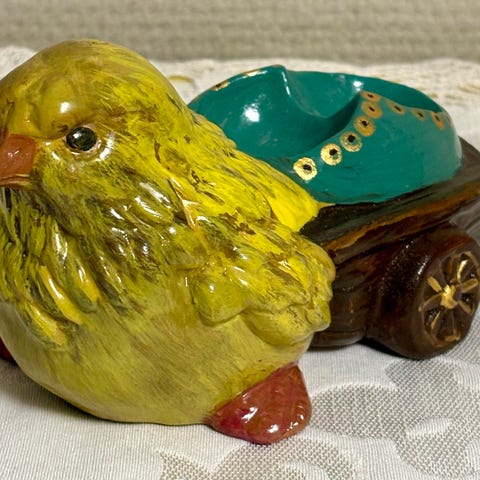Søt påskeskål med kylling. Høyde 10 cm, bredde 14 cm, dybde 8 cm. I god stand. Pris 100,-