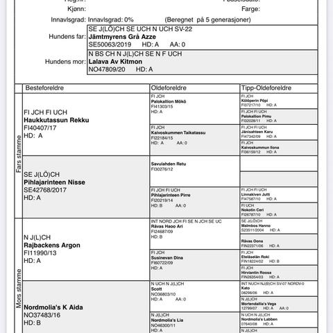 Meget gode stamtavler på både mor og fars side, med flere nordiske jaktchampioner og NM-vinnere.