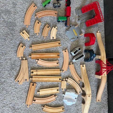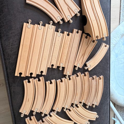 BRIO tretogskinner i tre, med både buede og rette skinner. Delene kan brukes som ekstra skinner eller utvidelse til BRIO togbane og er kompatible med andre BRIO tretogdeler i standard størrelse. Passer til lek på gulv eller lekebord sammen med tog, vogner og tilbehør fra samme system.