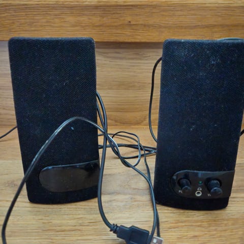 🤖 AI sier: Creative høyttalere til PC. Sett med to kompakte høyttalere i svart farge, beregnet som tilleggsutstyr til datamaskin. Høyttalerne har innebygd volumkontroll på siden og tilkoblingskabel for bruk med PC eller annen kompatibel lydkilde. Egner seg for enkel lydavspilling ved skrivebord eller arbeidsstasjon.