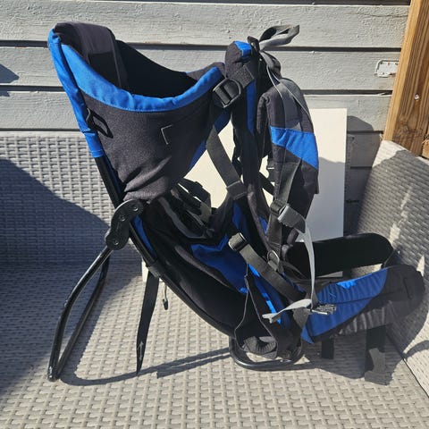 Bergans bæremeis i blå og svart farge. Meisen har polstret rygg og skulderstropper for bæreren, samt hoftebelte for bedre vektfordeling. Barnet sitter i et polstret sete med justerbare seler. Det er solskjerm/tak over barnesetet som kan tas av. Bæremeisen har en enkel sekk som også kan tas av om ønskelig.
