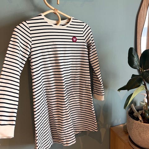 H&M L.O.G.G. kjole for jente i størrelse 152. Kjolen er laget av 100 % bomull og har blå og hvite horisontale striper. Modellen har 3/4-lange ermer og rund hals. Passer til hverdagsbruk og fritid for barn i aktuell størrelsesgruppe.
