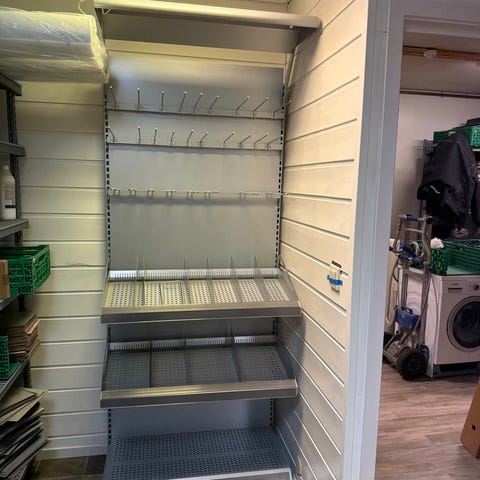 Selger smal hylle med kroker.