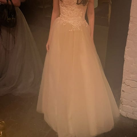 Merker nederst på kanten synes ikke når man har på kjolen med tyllen over. Er ikke renset men bør renses før bruk. Derfor selges den til en rimelig pris.