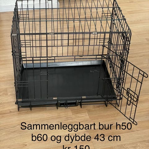 To metall hundebur i rektangulær og skrå form, svart farge. Burene har gittervegger og -tak, samt uttakbar bunnskuff i plast for enkel rengjøring.