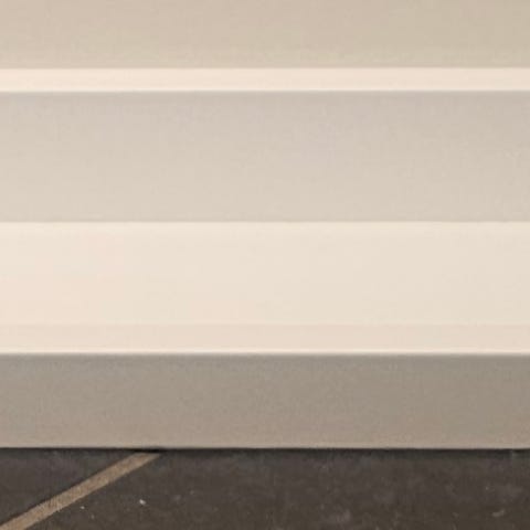 Hvit, profilert vegghylle. Den har en del hakk og bruktsmerker, men de fikses enkelt med litt maling. Festes til veggen led to skruer.