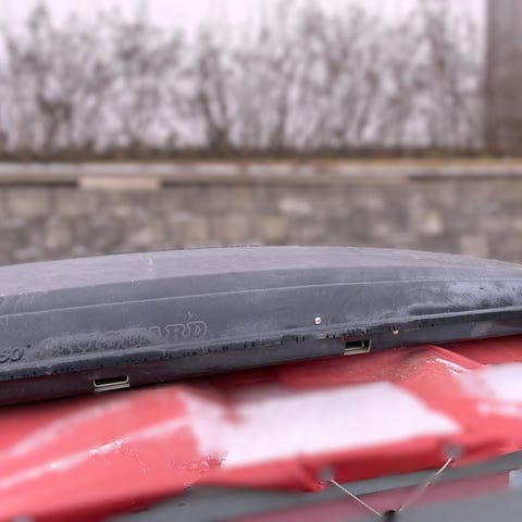Grå skiboks. Hengt inne i garasje
