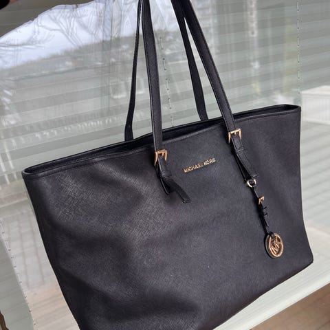 Michael Kors skinnveske for dame i svart lær. Vesken har doble hanker for bæring i hånden eller over skulderen. Den lukkes med glidelås på toppen. Innvendig har vesken flere rom og lommer, inkludert glidelåslomme og åpne lommer for organisering av innhold som lommebok, mobil og småting.