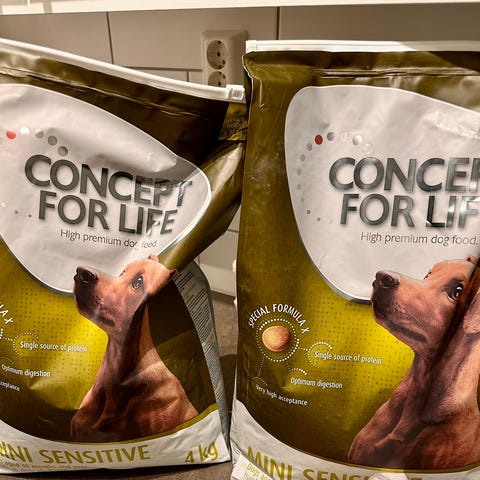 Selger uåpnet poser med Dyrisk Original og Valp hundefôr, begge sekker er på 2 kg hver.