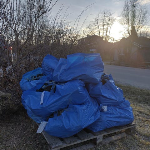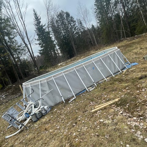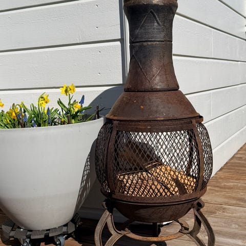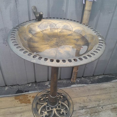 Sliten, begynt å ruste hull i bunn som er tettet, men fungerer fint for fuglene.