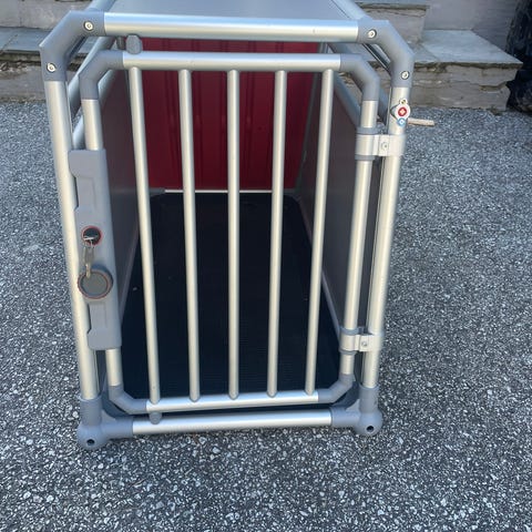 Buret er utformet med skrå bakside for å passe i bagasjerom på bil, og har én dør i front som kan låses med mekanisme på siden.