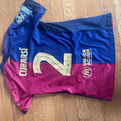 Nike FC Barcelona hjemmedrakt fotballtrøye med spillertrykk Raphinha 11. Trøyen er i blå og rød vertikalstripet design med gule detaljer, klubbmerke til FC Barcelona og Nike-logo på brystet samt sponsorlogo på fremsiden. Kjøpt på DH gate. På ermet er det Champions League-merke og UEFA Foundation-patch. Modellen er laget i Dri-FIT-materiale i polyester for god fukttransport. Passer til bruk på fotballbane eller som supportereffekter på kamp og fritid. Størrelse M.