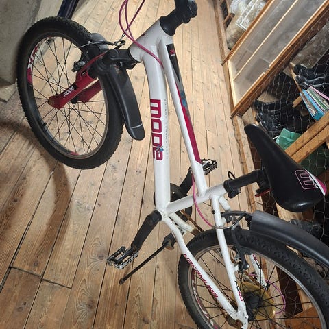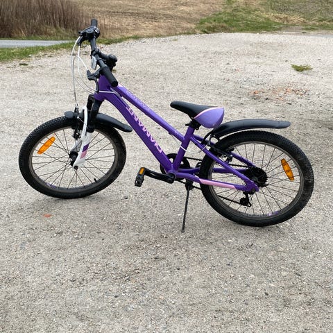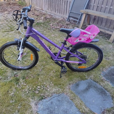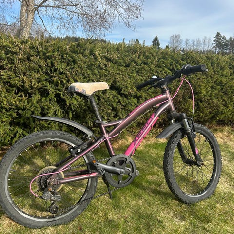 Barnesykkel med 20" hjul. Sykkelen har rosa ramme med lyse detaljer, rett styre og standard pedaler. Utstyrt med bremser foran og bak samt reflekser på hjulene. Egnet for barn som passer til 20" hjulstørrelse, for bruk på vei og gang- og sykkelvei.
