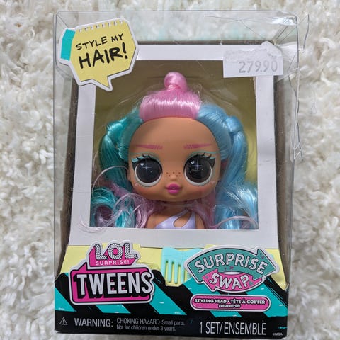 Dukken og håret er i kjempefin stand! Dukken har en minimal sølvmalings-flekk høyt oppe i pannen, dette er fra fabrikkproduksjon og smittet fra de sølvfargede brillene, og ikke et bruksmerke.