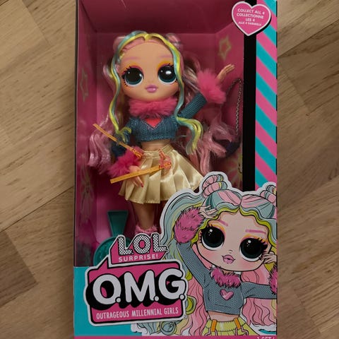 Kjempeflott dukke i god stand med mange originaltilbehør: Outfit med sko, mikrofon med stativ, briller og hårbørste. I tillegg følger med originalboksen som ser ut som en diger hårspray, den er hele 33cm høy!