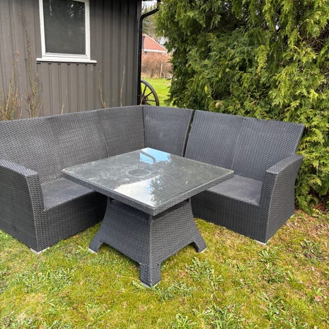 Sitte- og ryggputer er i lys tekstil, tilpasset hver modul. Møbelet er egnet for bruk på terrasse, balkong eller i hage, og gir sitteplass til flere personer. Kunstrotting er et materiale som er beregnet for utendørs bruk og kan normalt stå ute store deler av sesongen, avhengig av vedlikehold og værforhold.