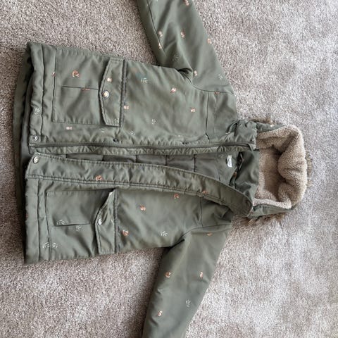 Newbie jakke for gutt i størrelse 122. Jakken er grønn med mønster og har hette med fôr. Passer som ytterjakke til hverdagsbruk i kjøligere vær.